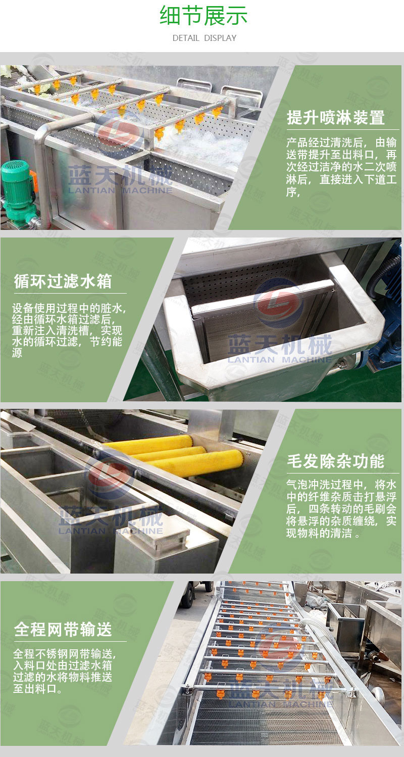 大型清洗淮山的机器利用气泡冲击波原理能够将淮山、蔬菜、瓜果表面冲洗干净,提高50%以上的工作效率,分解残留农药;本机设有隔菜板,将清洗物与洗下的泥沙有效隔离开,减少了水的浑浊度,大幅提高了清洗水循环利用率,可节约80%的清洗用水,节省了人力;操作方便,省时省力,能耗低,卫生、安全、效率高。